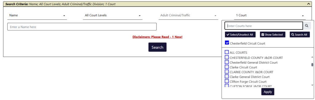 Chesterfield Circuit Court case information is handled through the Virginia judicial records system and the local circuit court clerk’s resources. The primary online system used for case lookup is the Virginia Courts Case Information platform. This system holds statewide circuit court records, including Chesterfield County criminal cases, civil filings, and docket entries. It organizes case data by name search, case number search, and filing details. Users can review case status, hearing schedules, and judgment summaries through this record database.