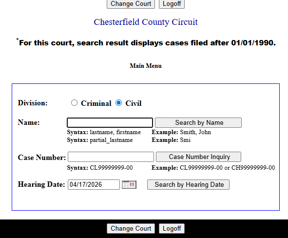 - Select Chesterfield County from the available list of circuit courts.